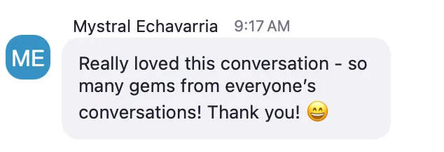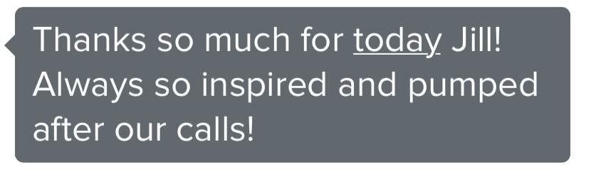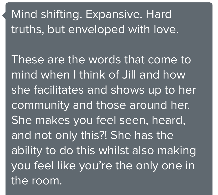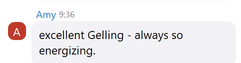 "Life changing gelling this year. Every time I think I just have a tactics question, we end up working through the identity I have yet to embrace." - Kat